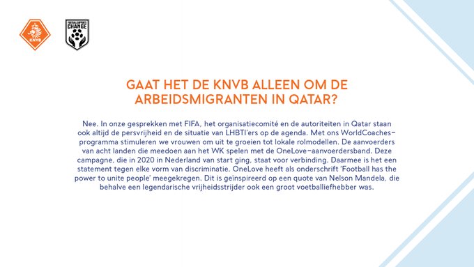WK-organisatie alles wat er op hun social media wordt geplaatst rond dat WK mag gebruiken op zijn social media. Nog een addertje onder het gras? Zeker: hun posts moeten wel positief zijn. Op zich gebeurt dit heel vaak met influencers en merken, maar juist omdat Qatar al zo omstreden is, is dit enorm problematisch. De supporters beweren dat het feit dat de KNVB ook ‘gewoon’ aan het evenement meedoet, een reden is om wel met de WK-organisatie van Qatar in zee te gaan.