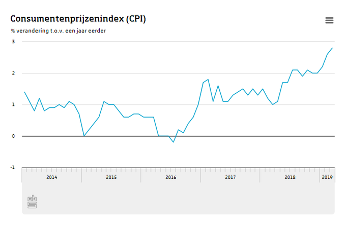 De prijs voor voedingsmiddelen is 3,8% toegenomen ten opzichte van maart 2018. Dat heeft ongetwijfeld te maken met de BTW-stijging in januari dit jaar. Door de verhoging van zes naar 9 procent zijn veel goederen in prijs gestegen. Bovendien ronden supermarkten de bedragen naar boven af. Fruit, vlees en aardappelen zijn voornamelijk in prijs gestegen. Het is nog maar twee keer eerder voorgekomen dat de prijs van voeding zo hard omhoog is gegaan de afgelopen tien jaar. Benzine is ook behoorlijk in prijs gestegen (5%) en we betalen ook meer aan huisvesting, water en energie.