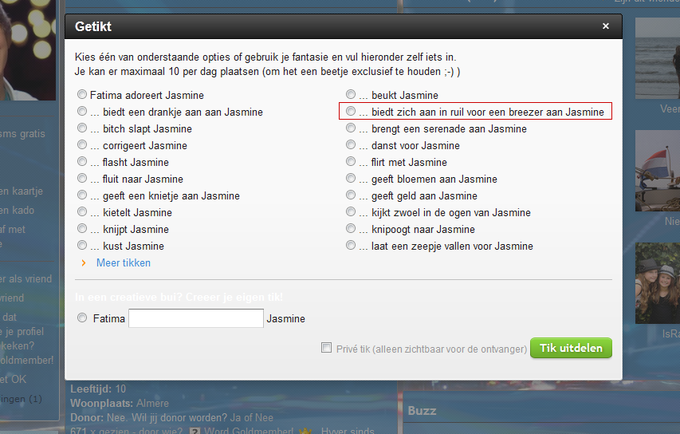 Tikken was de manier om even kort iets tegen elkaar te zeggen. Zo kon je jezelf aanbieden in ruil voor een breezer (dus...), en je had natuurlijk de 'bitch slap' en 'laat een zeepje vallen'. Hele bijzondere acties als je het mij vraagt, helemaal omdat er ook veel jongeren op de site zaten.