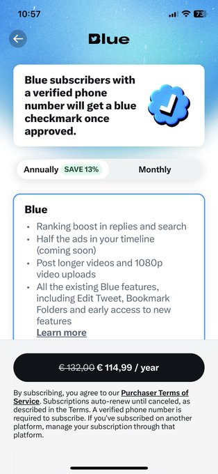 Wil je een abonnement afsluiten, doe dat dan direct bij Twitter in de browser. Dan kost het abonnement 8 euro, wat het ook in andere landen kost. Apple en Google houden er nogal scherpe commissieregels op na, waardoor een abonnement afsluiten in de iOS-app of de Android-app je twee euro per maand meer kost (dus 24 euro per jaar extra). Twitter wil die commissie niet zelf betalen, maar berekent die direct door aan klanten.